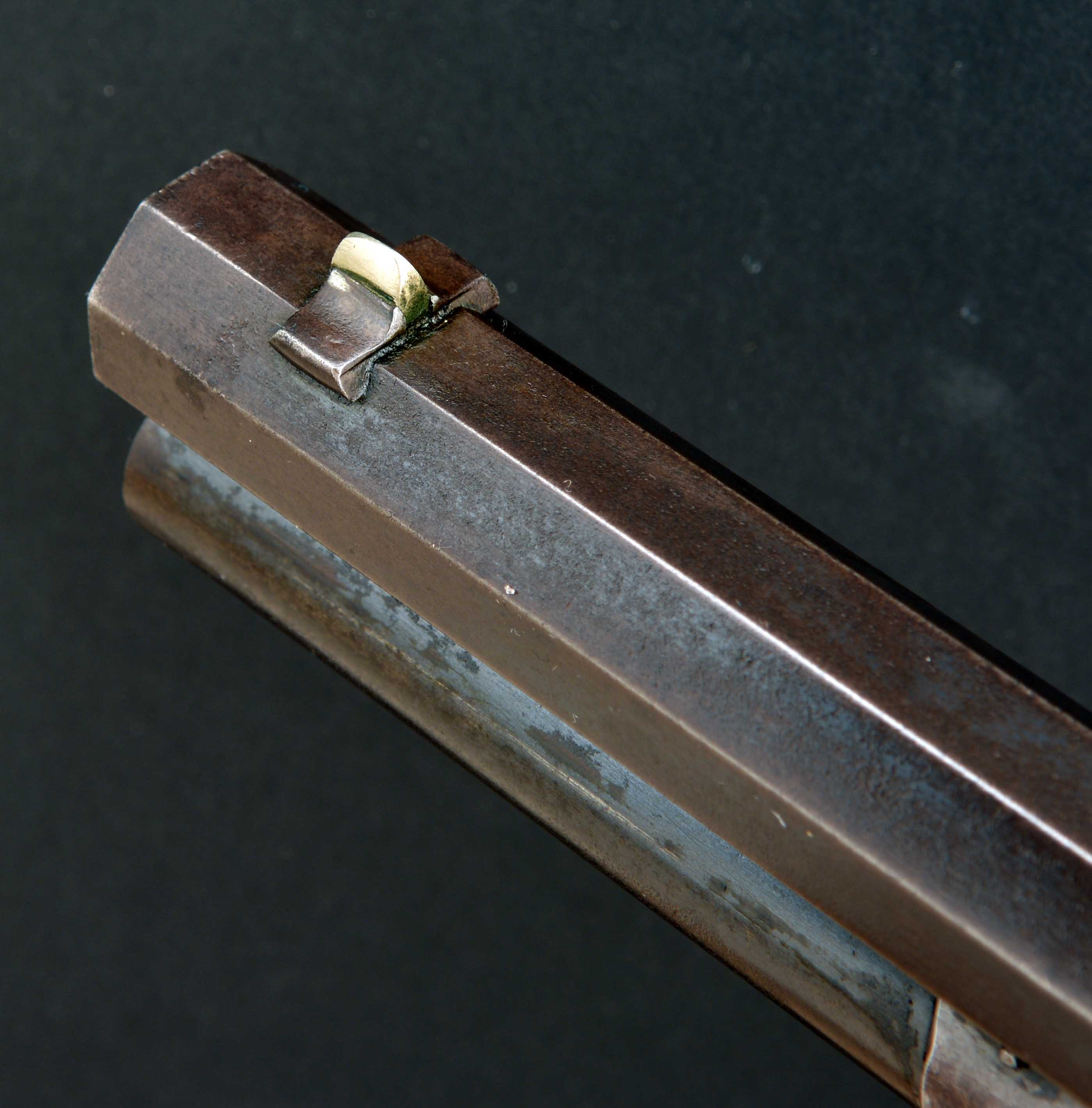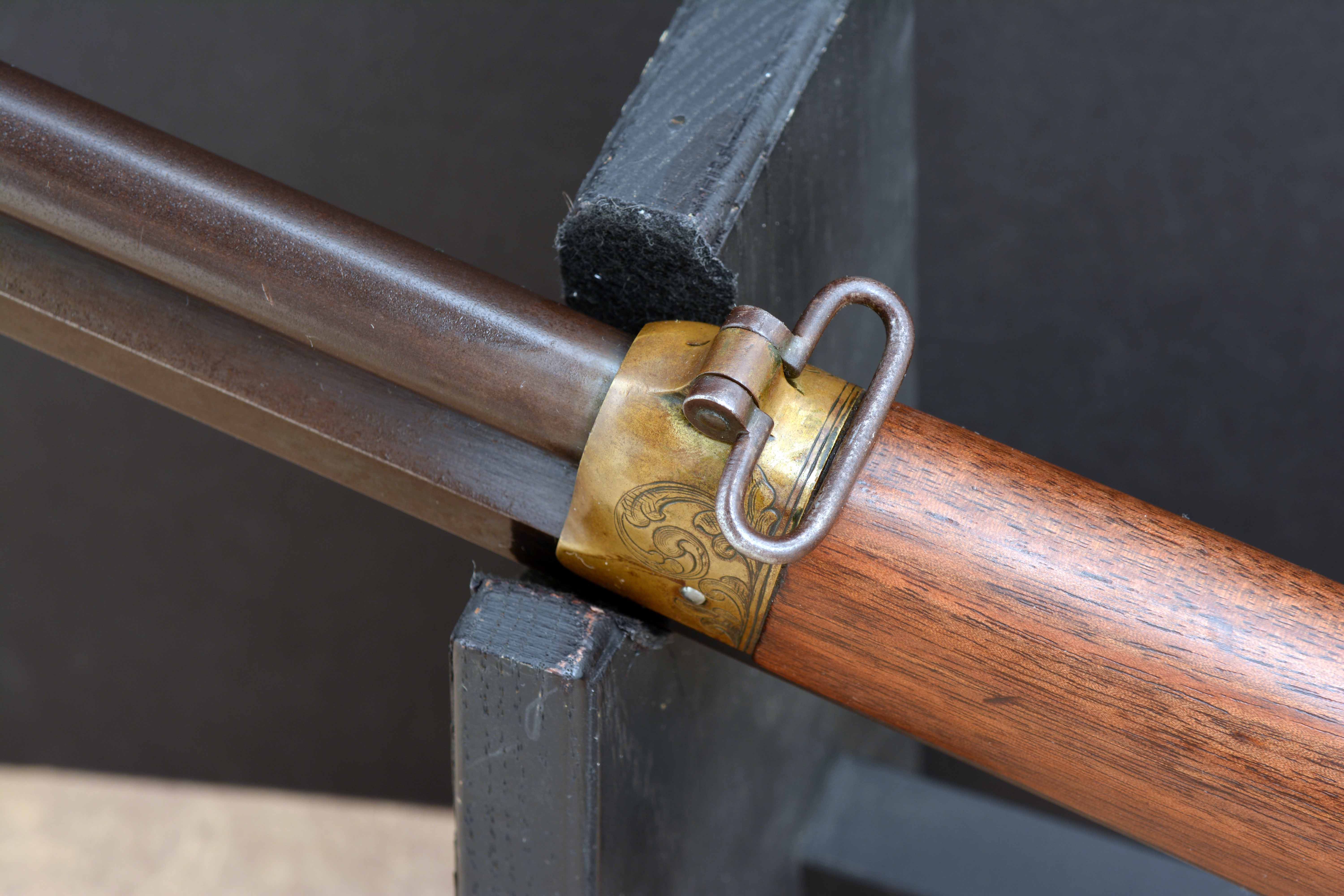 Winchester 1866 Second Model Henry-Marked Nimschke Engraved Rifle .44 Henry RF s/n 16114 mfg 1868 – 24” octagon barrel; full mag; beautiful and masterfully executed engraving appears to be the work of Louis D. Nimschke or his NY shop on the receiver, forend cap and buttplate with traces of old silver plating; correct early second model "pinched" forend cap sling swivel mount; correct early s/n location inside lower tang; 900 yard retaining screw folding leaf rear sight; sporting front sight; uncheckered 1x (or "extra finish") walnut stocks with correct factory-installed sling swivels. Barrel and magazine retain a high degree of original blue finish with a plum patina mixing in; stocks retain have been cleaned and retain an oil finish; receiver has sharp edges; action is crisp; bore is bright, shiny and retains good rifling and is considered an 8 on a scale of 1 to 10; s/n marking "16114" is correctly stamped on the left side of the lower tang under the stock, on the inside toe of the crescent buttplate, and on the stock's upper inletting channel. |