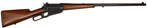mfg 1910 - 28" round barrel, straight grain walnut in a factory modified musket configuration without top hand guard and shortened forend. Blade in integral base front and Lyman receiver sight; plug screws in barrel for an absent musket type sight. Barrel is marked with "8-25-16" and is in the unpolished, white. Rifle was used by Winchester as a test rifle being in inventory as of 3-11-1957 and listed in the book 'The Standard Velocity Test Rifle'.